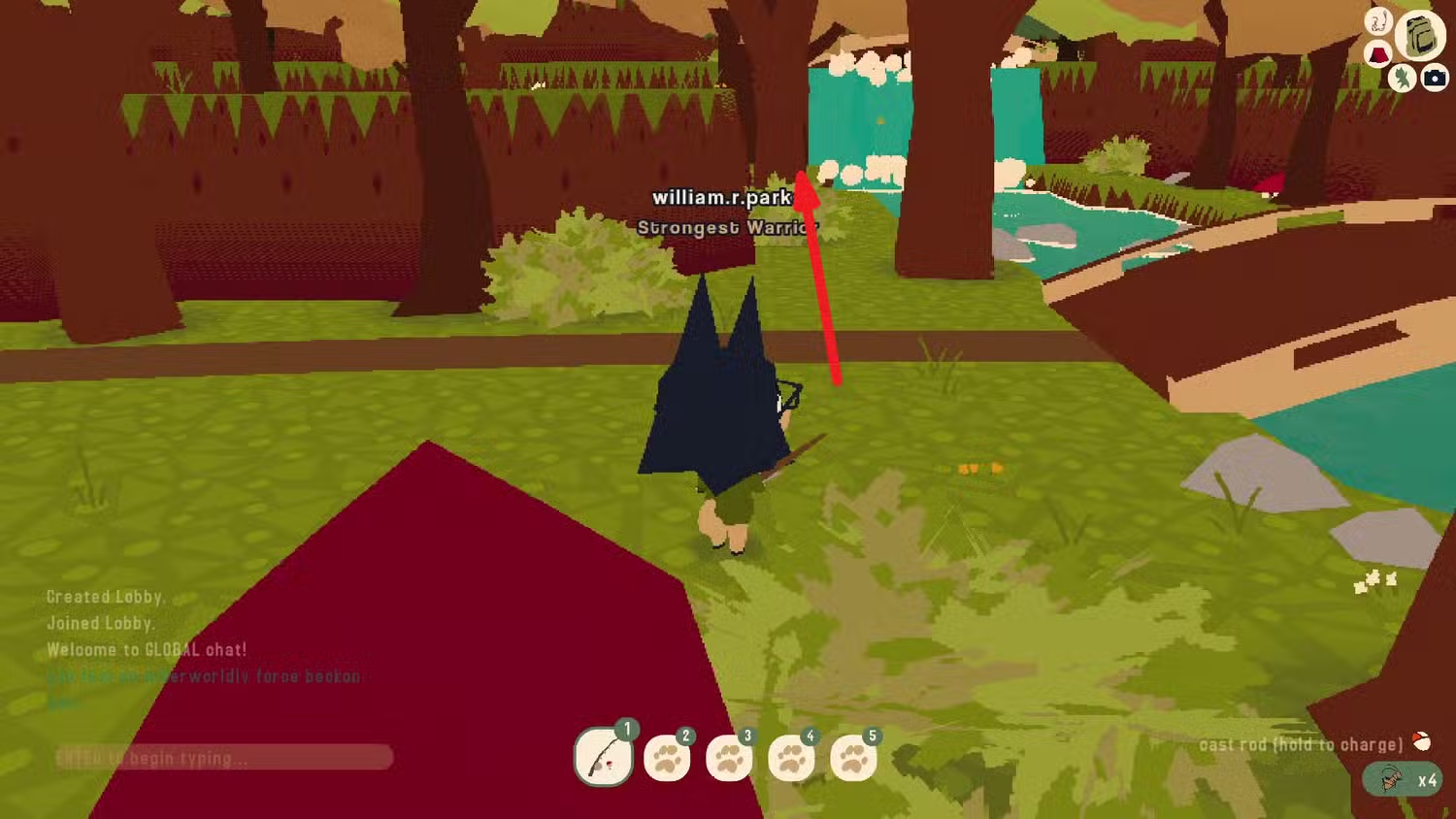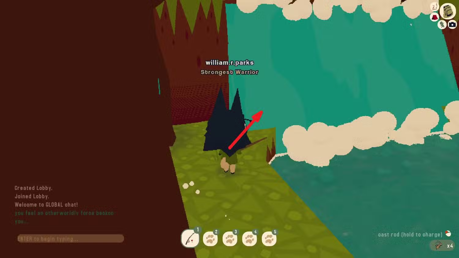 Players should now return to spawn and navigate to the lake that is across from the upgrades and cosmetics cabin. Fans can use a blue mushroom to quickly reach the far side of the lake and then follow the path to the right. This path will lead players to an area with a ladder that they should climb.